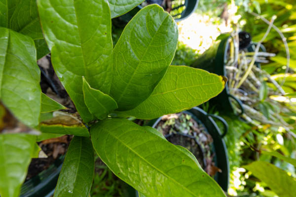 This medium to large tree can reach 20–25 meters in height. It has smooth, greyish bark that exudes a milky latex when cut. The leaves are glossy, elliptical, and arranged in whorls of 4–8 at the stem nodes. The small white-green flowers appear in clusters and are mildly fragrant.