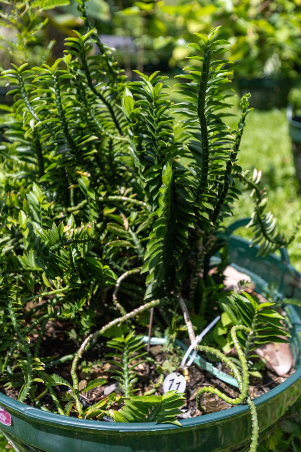 This species grows to around 1–2 meters tall, forming upright, fleshy, green stems that curve in alternating segments, creating a spine-like pattern. The small, thick leaves grow alternately along each ridge, giving the plant a rhythmic, architectural appearance. It occasionally produces small red bracts at the stem tips. The latex sap is mildly toxic and characteristic of its family.