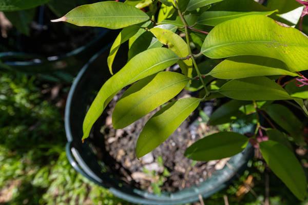 This medium-sized evergreen tree grows 10–15 meters tall, with smooth grey bark and opposite, leathery leaves. The new shoots are reddish-pink, turning glossy green as they mature. The striking pink to crimson flowers bloom in clusters directly on the branches, followed by pear-shaped fruits with a mild, watery sweetness.
