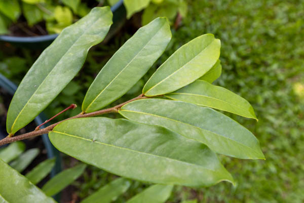The tree grows up to 10 meters tall with smooth brown bark and glossy, lanceolate leaves arranged alternately along reddish stems. When crushed, the leaves release a warm, sweet-spicy fragrance. Small yellowish flowers appear in clusters, followed by dark purple berries.