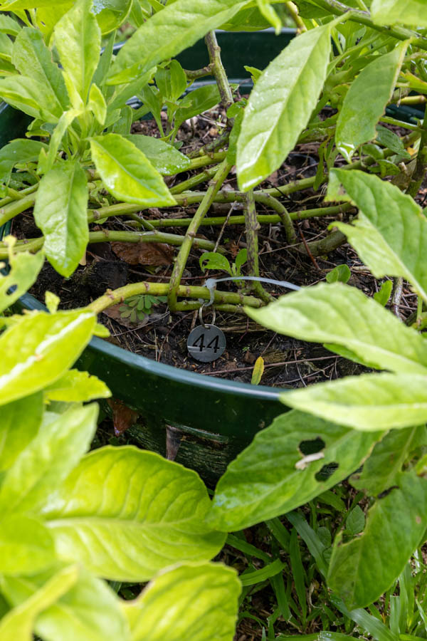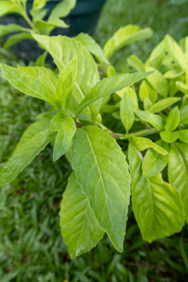 This evergreen shrub grows 1–2 meters tall with smooth, green stems and narrow, lance-shaped leaves. The foliage is soft and aromatic when crushed. Small white or pale purple flowers form at the tips of branches. It grows well in partial shade and moist, well-drained soil.